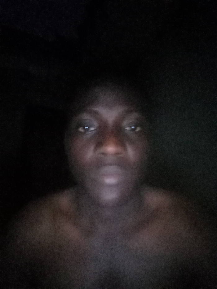 In the dim illumination, a person's face is visible, surrounded by darkness. The individual has dark skin, with eyes that reflect a faint light. Below the face, the upper part of the shoulders is visible, seemingly bare. The image lacks clarity and detail due to low lighting conditions. The overall impression is one of a fleeting, obscured presence emerging from the shadows.