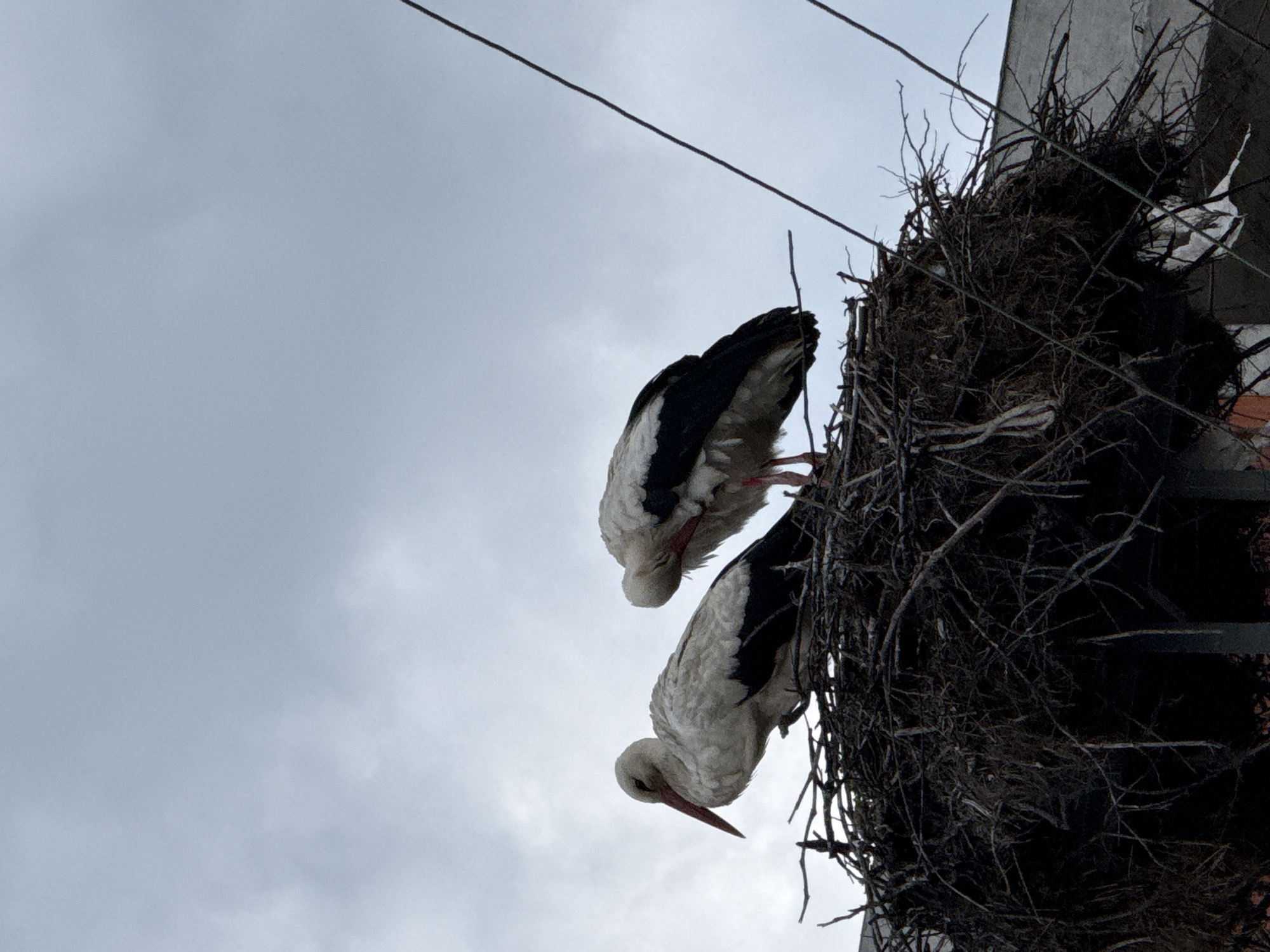 - "Two white storks with black wings and red beaks are perched in a large nest made of twigs and branches" by FM-GT2u92, licensed under CC BY 4.0