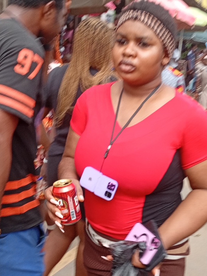 A woman with a brown and pink striped headband wears a red and black top. She holds a can of B.B. in her hand, showcasing long white nails. A purple phone hangs from a lanyard around her neck, while another phone in a similar case is held in her other hand, wrapped in what appears to be a black plastic bag. The background is busy and out of focus, but other people are visible. A man in a black shirt with the number "97" printed on it is partially visible on the left.