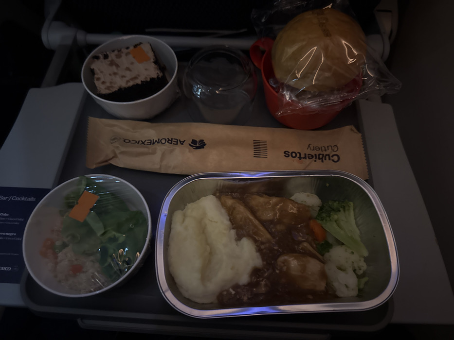 An in-flight meal is displayed on a gray tray table within a dimly lit aircraft cabin, likely associated with operations at Aeropuerto Internacional Ezeiza, Argentina. The tray contains a main course in a rectangular aluminum foil container, consisting of mashed potatoes, meat with brown gravy, and steamed broccoli, cauliflower, and carrots. To the upper left, a round white bowl sealed with clear plastic film holds a green salad with white grains and red components; an orange rectangular tag is visible on the film. To the upper right, a second round white bowl contains a dark dessert topped with a lighter cream and small orange elements. A long, brown paper pouch bearing the "AEROMEXICO" logo and "Cubiertos Cutlery" text is positioned centrally. Below this, a clear plastic cup holds a dark liquid. To the lower right, a plastic-wrapped bread roll is placed within a red plastic holder. No individuals are visible.