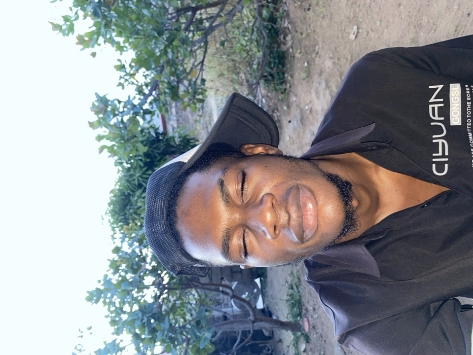 An outdoor, eye-level portrait depicts a young adult male in Udu, Nigeria. The subject, positioned centrally, has dark skin, a short beard, and his eyes are closed. His lips are slightly pursed, and his head is subtly tilted back and to the left. He wears a black collared shirt, partially unbuttoned, featuring white text "CIYUAN" above "GONGSL" on the right chest area. A black mesh baseball cap is worn backward on his head. The background consists of a dirt ground and various green-leafed trees and bushes under a bright, overcast sky, indicating an outdoor daytime setting with natural light. A dark, circular object, possibly a large tire or part of industrial equipment, is partially visible and blurred behind the subject on the left. No other individuals or explicit urban landmarks are discernible.
