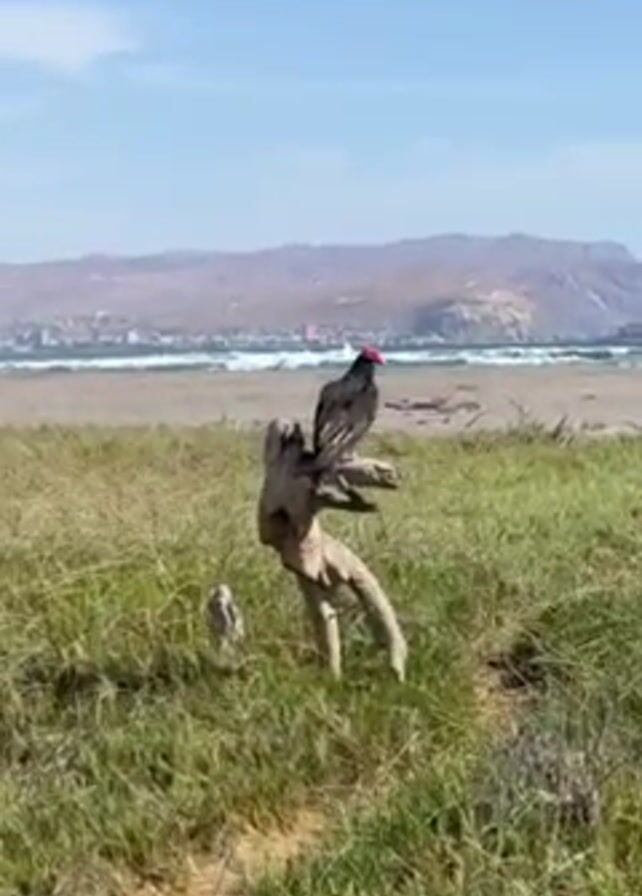 turkey vulture perched on a dead, twisting branch in a grassy field. In the background, there's a sandy beach, an ocean with breaking waves, and a distant mountain range under a clear blue sky. The vulture is primarily black with a bright red, featherless head. The grass in the field is mixed with brown patches, suggesting dryness.