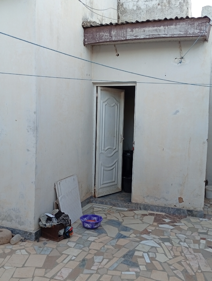An open white door is set into a wall of a light-colored building. Above the door is a rusty metal overhang. A clothesline extends across the scene. The ground is tiled in irregular shapes and colors. A purple bowl, an open box filled with objects, and a white board lean against the wall to the left of the door. Inside the doorway, dark buckets are visible.