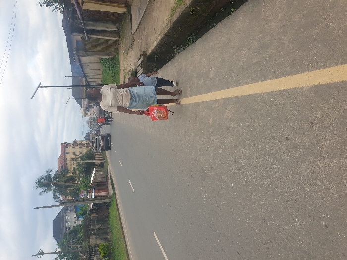 The image displays an outdoor street scene in the city of Aba, Abia State, Nigeria, under an overcast sky