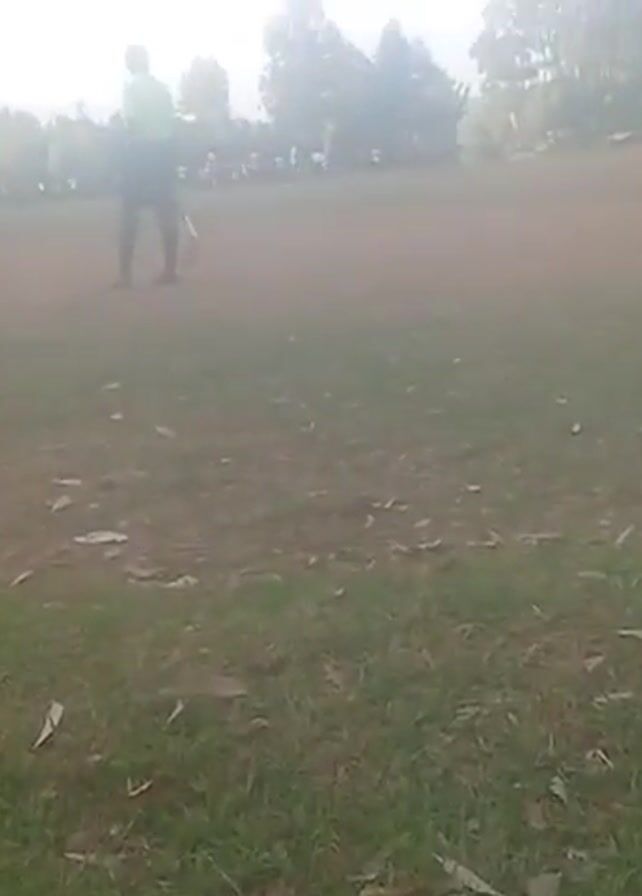 grassy field on a slightly overcast day. A person wearing a light green shirt and dark shorts stands in the middle of the field, facing away from the camera, and appears to be holding a long, thin object, possibly a stick or a bat. Trees are visible in the background, along the perimeter of the field. The foreground is mostly grass with some patches of bare earth and scattered leaves. The camera is held low to the ground, and a small portion of a finger is visible in the lower left corner of the frame. The overall impression is a simple, static shot of an individual in a park-like setting.