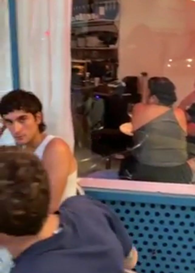 people at an outdoor cafe. A woman wearing a white shirt pours wine from a green bottle into a wine glass. A man wearing a white tank top sits next to her, casually resting his arm on the table. Another man in a blue shirt stands nearby, looking at his phone. The cafe has a blue exterior with a tiled floor. Inside, there are other people at the bar, and the atmosphere appears relaxed.