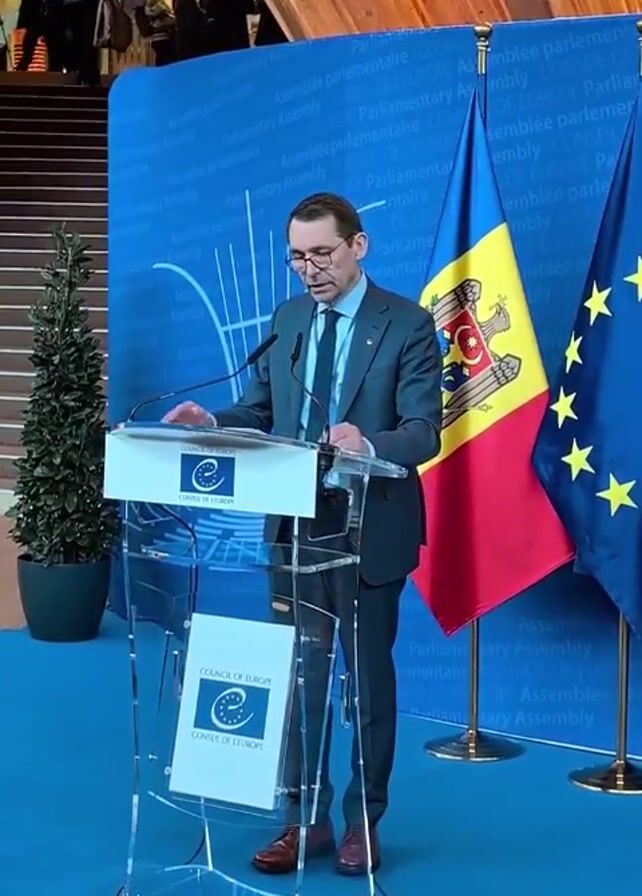 A man in a suit stands at a clear podium addressing an audience. He wears a light blue shirt, a dark blue tie with a small emblem, and a lapel pin. The podium displays the Council of Europe logo. Behind him is a blue backdrop with the words "Parliamentary Assembly" in English and French. Flags of Moldova and the European Union stand to his right. A small potted tree sits to his left. People can be seen walking in the background near a staircase. The man appears to be reading from a document on the podium and gesturing as he speaks. The floor is covered in a blue carpet.