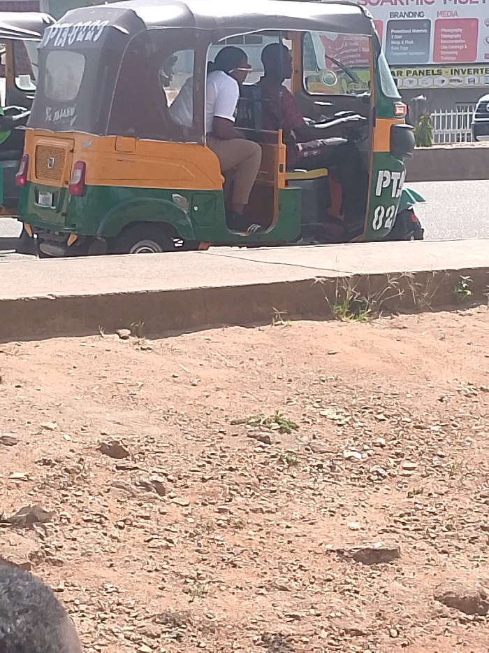 An urban street scene in Jos, Nigeria, depicts a three-wheeled passenger vehicle, commonly known as a Keke Napep, on a paved road