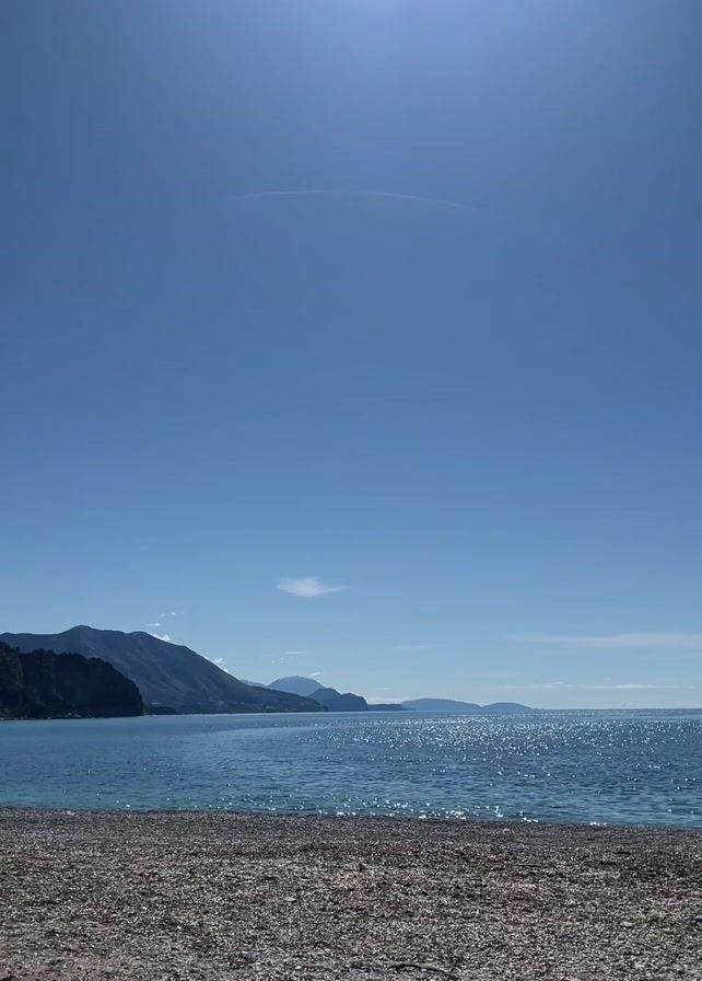 daytime scene of a beach with a pebble shoreline, turquoise water, and a range of mountains in the distance under a clear blue sky. The sun is high in the sky, causing a glare. There are no people or visible objects on the beach. The water is calm with small glimmers of sunlight.