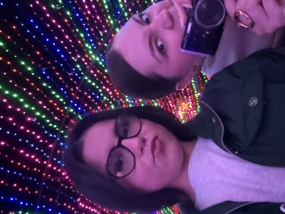 Two women pose close to the camera within an environment filled with colorful lights. The woman in the foreground wears round glasses, a white shirt, and a dark green jacket. The woman behind her holds a compact camera. The background features rows of multi-colored lights, mainly blue, red, green, and yellow. They appear to be within some kind of light display or art installation.