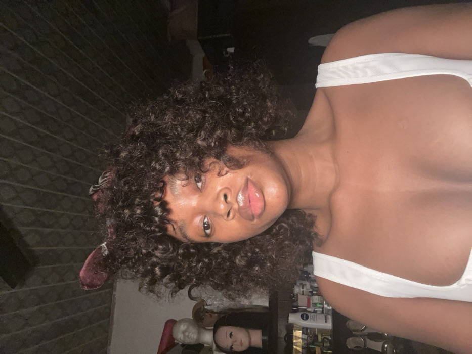 A dark-skinned woman with curly hair and bangs poses for a selfie. She wears a white top with straps. A burgundy hair accessory is visible. The background includes a wall or textured surface, a table with various items including bottles and containers, and a couple of mannequin heads. Her lips are glossy, and she looks directly at the camera.