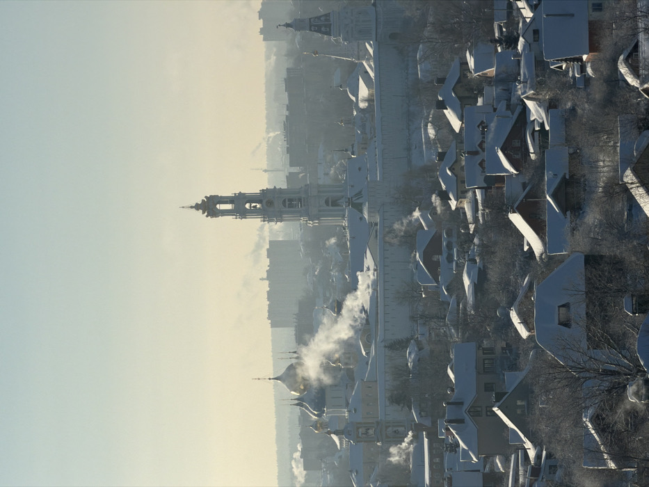 An aerial shot of a town blanketed in snow, with rooftops heavily laden. A church steeple pierces the skyline, and steam rises from chimneys, suggesting the warmth within. The landscape is muted in color, dominated by white snow, grey buildings, and a pale sky. The image is rotated ninety degrees counter-clockwise.