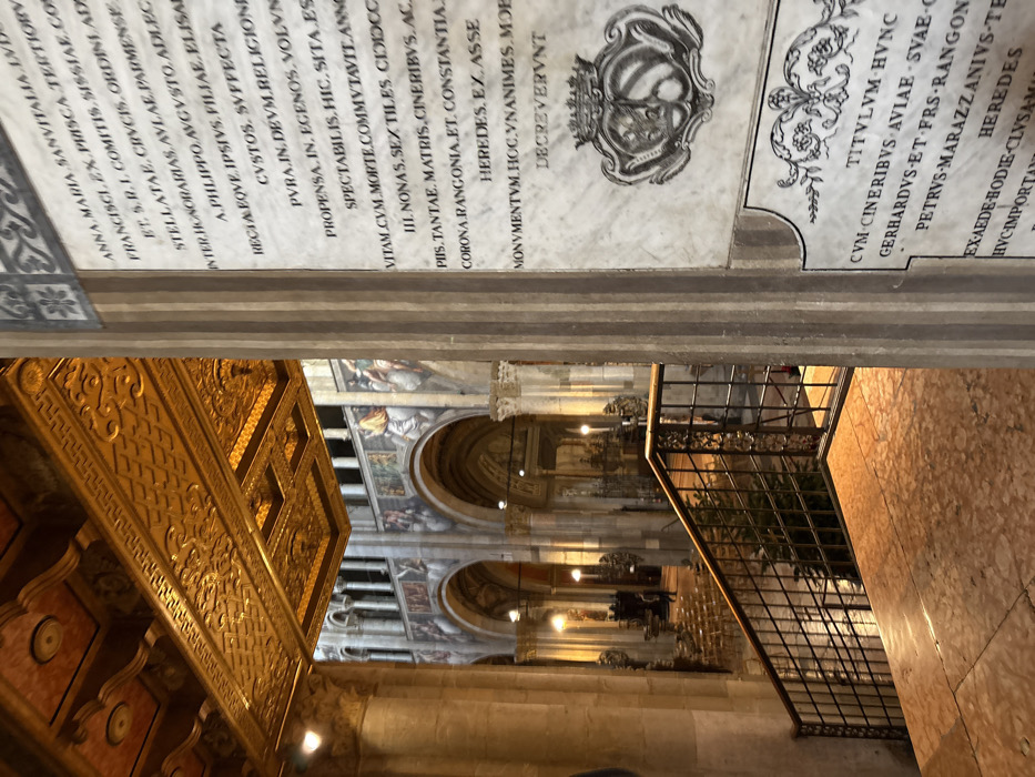 This image depicts the interior of the Parma Cathedral (Duomo di Parma) in Parma, Italy, viewed from an elevated position overlooking a lower section of the nave or transept. In the immediate right foreground, a large, vertically oriented marble commemorative plaque is prominently displayed. It features extensive Latin inscriptions in a black serif font, with some sections arranged diagonally. Below the main text, a carved heraldic crest or coat of arms is visible, followed by additional Latin text and ornate decorative borders. To the left of this plaque, a fluted column, lighter in color, is partially visible. Overhead in the left foreground, an ornate, gilded rectangular soffit or ceiling element is suspended, featuring intricate geometric and floral patterns in high relief, against a reddish-brown background. This element appears to be part of a larger, elaborate coffered ceiling structure. In the midground, a set of stairs with a dark metal railing descends towards the lower floor. The railing consists of a horizontal top bar and a grid of vertical and horizontal bars with some decorative scrollwork. The landing at the top of the stairs is paved with polished, mottled marble in shades of light red and brown. Behind the railing at the base of the stairs, a small, illuminated Christmas tree is visible. The background reveals the main interior space of the cathedral, characterized by a series of grand arches supported by large, round stone columns. The walls above these arches are adorned with elaborate frescoes depicting figures and narrative scenes, rendered in a classical style with a palette of earthy tones, blues, and reds. The overall lighting within the cathedral is dim, with warm artificial light emanating from fixtures, illuminating various architectural elements and frescoes. A few indistinct human figures are discernible in the far background on the lower floor, appearing small against the scale of the architecture.