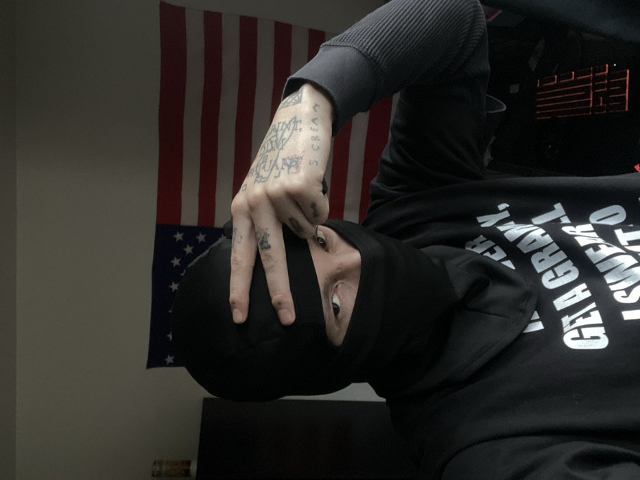An individual is depicted in an indoor setting in Orsay, France, from a chest-up perspective. The person wears a black balaclava covering the head and face, leaving only the eyes visible. A dark, possibly black, hooded sweatshirt is worn, displaying white text on the front; partially legible phrases include "I'M HERE", "GET A GRAVY,", and "I SWEAR O". The individual's left hand is raised, positioned near the head, with the index and middle fingers extended in a V-shape. The exposed skin of the left hand and fingers is heavily covered with tattoos, including the visible text "S CREA" on the back of the hand and "DEAD" on a finger. In the background, an American flag is draped against a light-colored wall. To the left, a dark piece of furniture and a bottle or can are visible. To the lower right, an object with illuminated orange internal lights, possibly a computer tower, is partially visible.
