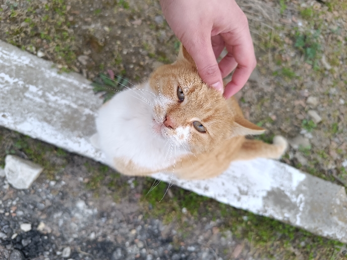 The scene, located in Cherkovitsa, Bulgaria, features a bicolored domestic cat interacting with a human hand in an outdoor environment. The cat, predominantly ginger with a white chest and facial markings, is viewed from an elevated perspective, looking upwards towards the camera. Its eyes are greenish-amber, and a pink nose is visible. A light-toned human hand, with fingers partially visible, is positioned at the top left of the frame, making contact with the cat's head near its right ear. The cat is situated on a granular ground surface consisting of small stones, earth, and sparse patches of green vegetation. A weathered concrete element, likely a curb or block, with gray and white discoloration, extends diagonally behind the cat from the lower left to the middle right of the frame.