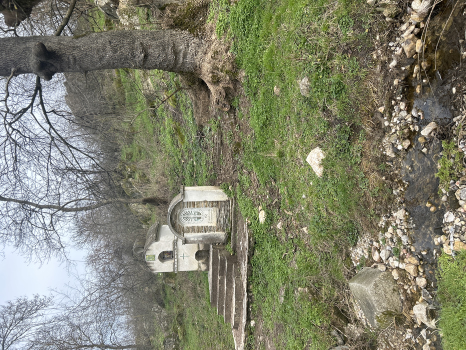 The image captures a hillside scene in Ostar Kamak, Bulgaria, featuring two small, white-painted religious structures positioned on an ascending, verdant slope. To the left, a multi-tiered shrine stands accessible by three concrete steps, displaying a cross on its lower portion and a green emblem above a recessed opening on its upper level. Adjacent to it on the right is a shorter structure with a semicircular arch, accented with stone, enclosing a decorative relief and Cyrillic text. The ground is covered with green grass, scattered rocks, and loose soil. A large, mature tree with exposed, gnarled roots and a distinct burl on its trunk anchors the right side of the frame. The background is dense with bare deciduous trees and rocky outcrops, suggesting a late winter or early spring season under an overcast, light gray sky. In the immediate foreground, a shallow stream with a pebbled bed flows from right to left, containing clear water and various small stones, alongside a larger, angular concrete block on its left bank. No individuals or animals are present in the scene.