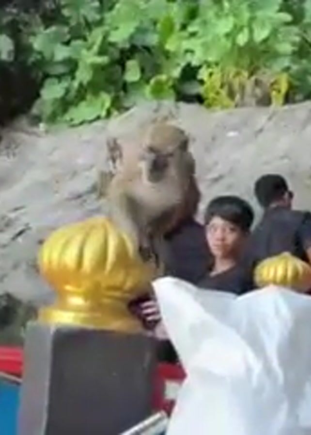 A monkey is sitting on a short, grey stone pillar topped with a shiny, golden ornament, right next to a woman and a boy. The woman has dark hair and is wearing sunglasses on top of her head. The boy is wearing a black shirt and has dark hair. A partially crumpled, white, plastic bag sits in front of them. They are standing on a staircase that is painted with vibrant colors, including red, green, and blue. People are walking up the stairs in both directions. The background shows a rocky hillside covered in greenery. Another monkey is visible on the hillside behind them.