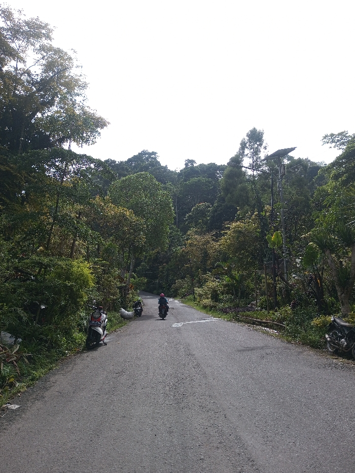 A gray asphalt road winds through a lush, green forest. The road curves gently uphill with dense trees lining both sides. A person rides a motorcycle up the road, while two parked motorcycles are visible at the roadside. One is on the left, and the other is on the right. A solar panel tower stands among the trees on the right. The sky is overcast and white.