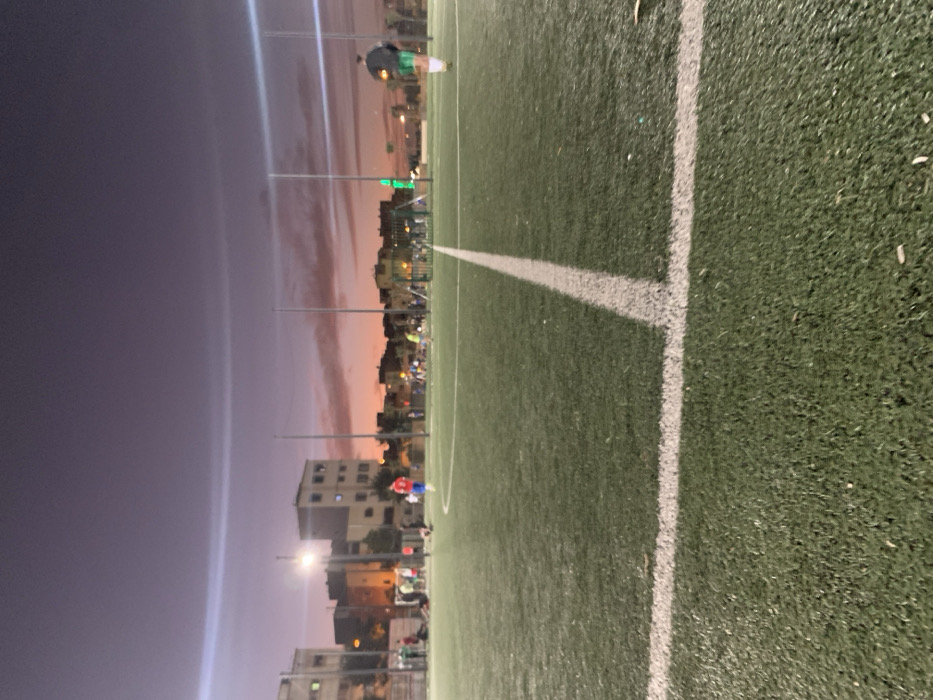 A sideways, long shot of a soccer field at dusk. The right side of the frame is dominated by green artificial turf with white lines. In the middle, a line of buildings is visible, interspersed with tall light poles. The sky transitions from orange near the horizon to a deeper purple towards the top left. A blurry figure wearing a green jersey is captured near the middle of the frame.