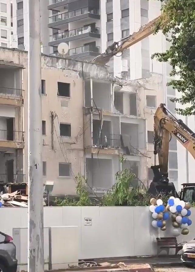 In an outdoor scene, a large yellow Sany excavator is in the process of demolishing a multi-story building. The building's structure is visibly damaged, with exposed interiors and debris falling. The excavator's arm is extended, reaching towards the top of the building. In the foreground, a white barrier fence partially obscures the lower section of the building and the base of the excavator. A cluster of blue and white balloons is tied to a bench next to the barrier. Several cars, including a grey SUV and a white sedan, are parked along the street in front of the fence. A tall, modern apartment building is visible in the background, contrasting with the demolition scene in the foreground.
