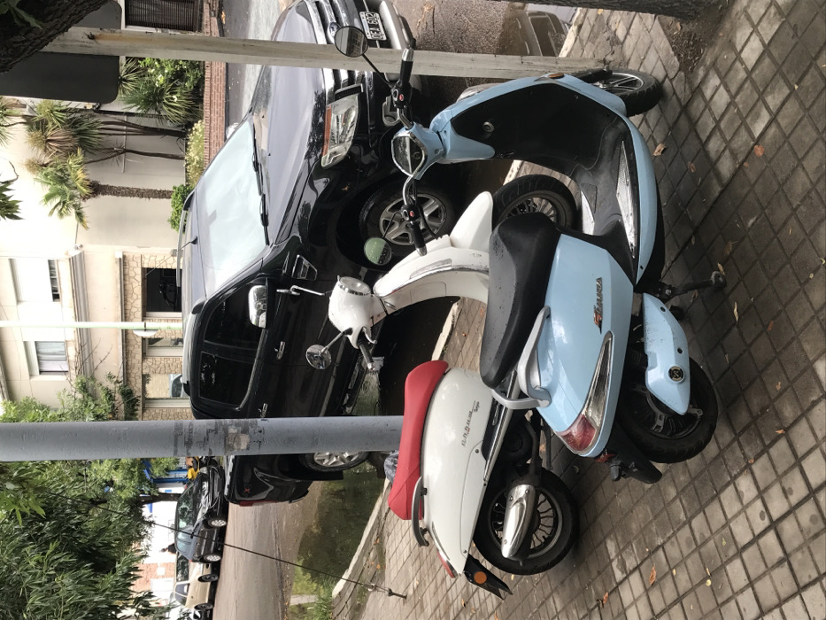 - "A black truck parks on a street next to two scooters: a light blue one and a white one with a red seat" by FM-7l6eJ3, licensed under CC BY 4.0