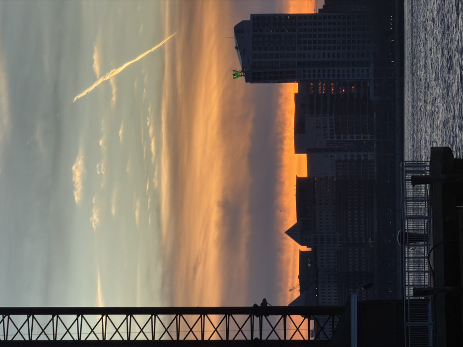A vertical cityscape displays an array of buildings against a sunset backdrop. The sky transitions from a light blue to a warm orange hue, marked by a contrail. In the foreground, the silhouette of a metal bridge spans across the bottom. A body of water reflects the light near some buildings to the right of the frame, where an industrial ladder and railing are also visible.