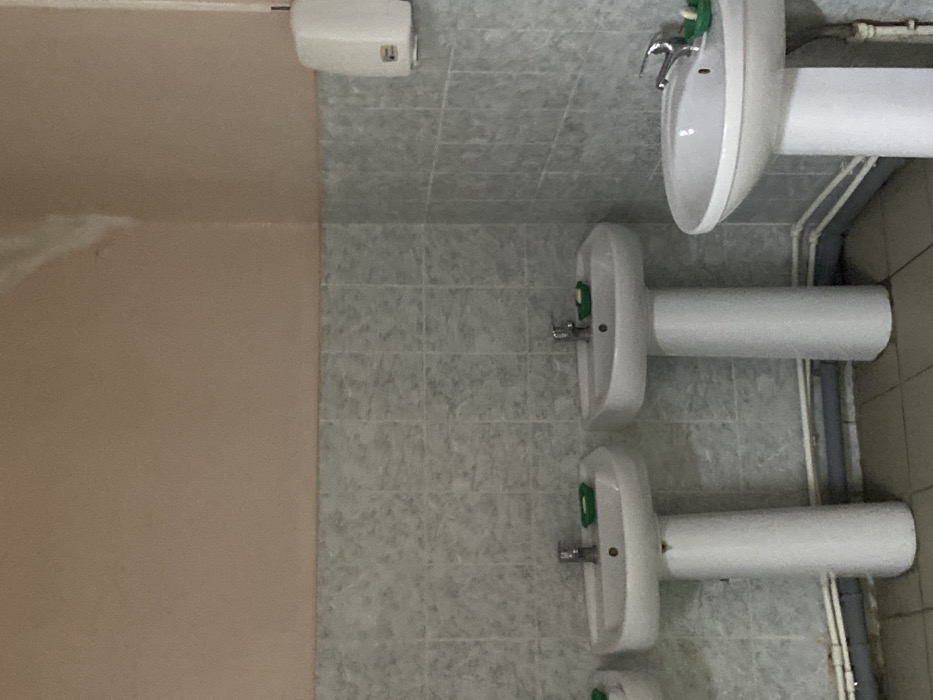 A public restroom shows a beige wall on the left, contrasted with gray tiled flooring. Three white pedestal sinks are aligned on the right, each featuring a green soap dispenser and a metal faucet. A white hand dryer is mounted on the wall above the sinks. Drain pipes are visible adjacent to the sinks. The photo is taken from an overhead perspective, capturing the utilitarian design of the restroom.