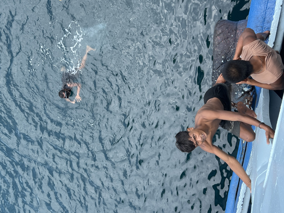 The image depicts a marine scene occurring in the waters near Ketapang, Indonesia. Calm, blue-green water occupies the majority of the frame, showing ripples and surface disturbance. In the upper half of the image, an adult male wearing a dark shirt and a diving mask is swimming horizontally, partially submerged, generating white foam behind him. In the lower foreground, a white and blue boat hull is visible. A young male, shirtless and wearing dark shorts, is actively climbing into the boat from the water, positioned on his knees and hands, looking towards the viewer with a slight expression. A black bracelet is on his left wrist. Adjacent to him, a large, dark-colored marine animal with distinct white spots, consistent with a whale shark, is partially submerged alongside the boat. A third male is seated inside the boat, observed from behind, wearing a tan sleeveless shirt, and facing towards the water and the large marine animal.