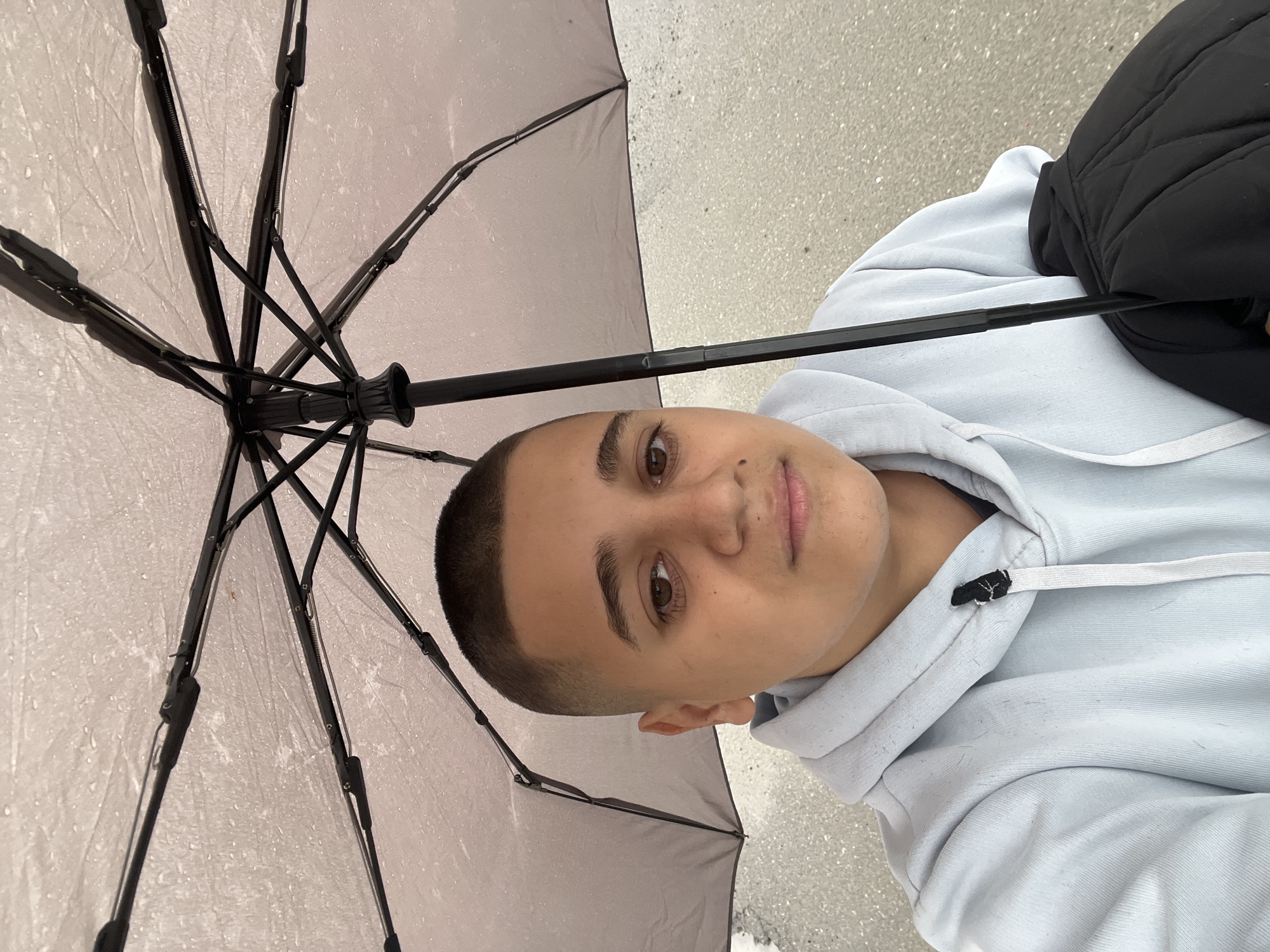 A person is holding a partially opened, clear umbrella with black ribs. The person has short, dark hair, brown eyes, and is wearing a light blue hoodie. A black jacket or bag is visible on the person's right side. The background appears to be a wet paved surface. The location is not discernible from this image.
