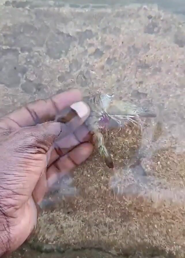 A dark-skinned hand holds a dead or dying shrimp in shallow water with a stone or concrete bottom