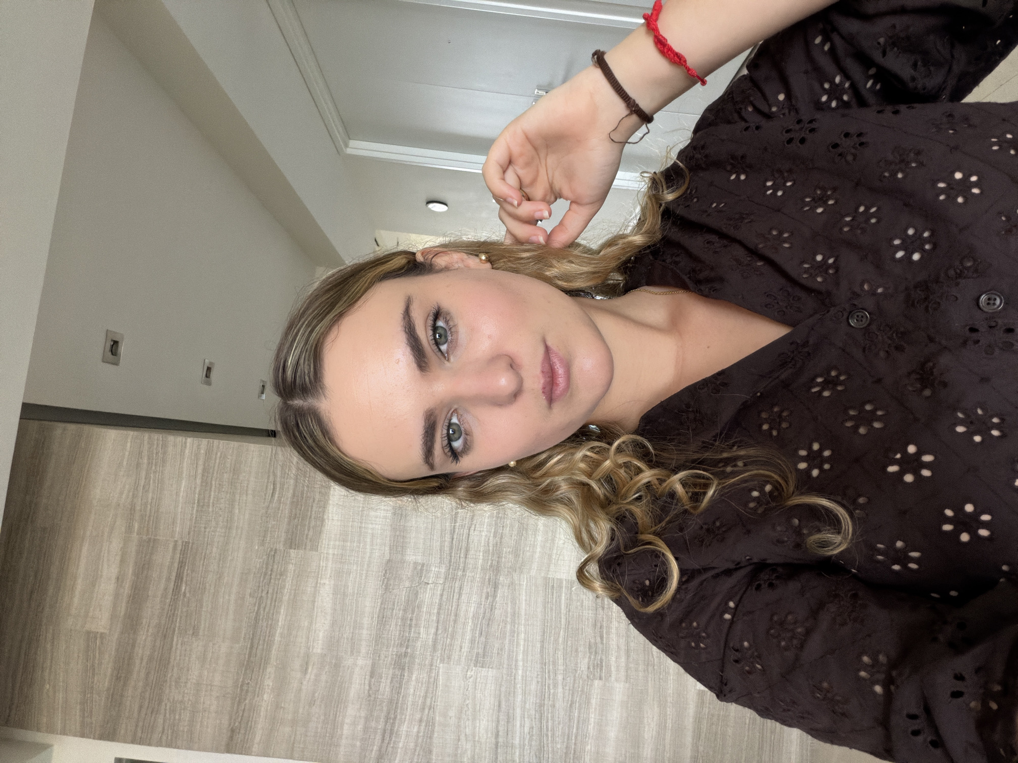 A woman is visible in an indoor setting. The scene appears to be a private residence, as indicated by the presence of wood-patterned flooring and neutral-colored walls with electrical outlets. The woman is wearing a dark brown, floral-patterned blouse with buttons. She is wearing a gold earring, and two bracelets, one red and one brown, on her wrist. Her hair is blonde with darker roots, styled in curls. The woman’s face is partially visible, and she is looking directly at the camera. The location in Key Biscayne, United States of America, cannot be determined from the image.