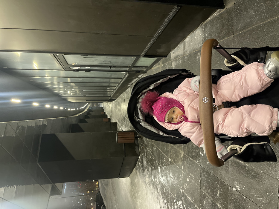 A baby in a pink snowsuit and matching hat with a pom-pom is seated in a stroller. The stroller is on a tiled walkway next to a modern building with a sleek, dark exterior. Lights line the building's edge, and a staircase descends in the distance. The scene appears to be in a city at night, as city lights can be seen in the background. The overall impression is one of a chilly urban setting.