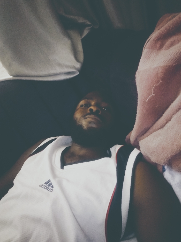 In Fagge D2, Nigeria, a single adult male is depicted in a close-up, upward-angle portrait. The individual, of apparent African descent, possesses a dark beard and is lying on his back, looking directly towards the camera. He wears a white sleeveless athletic jersey featuring a black collar and vertical red and black stripes on the sides. A reversed Adidas logo is visible on the chest of the shirt. The background is dim, revealing draped fabrics: a light grey material with folds is positioned to the upper left, and a textured, pinkish fabric, possibly a towel or blanket, is visible to the upper right. The scene is moderately lit, with visible soft shadows.