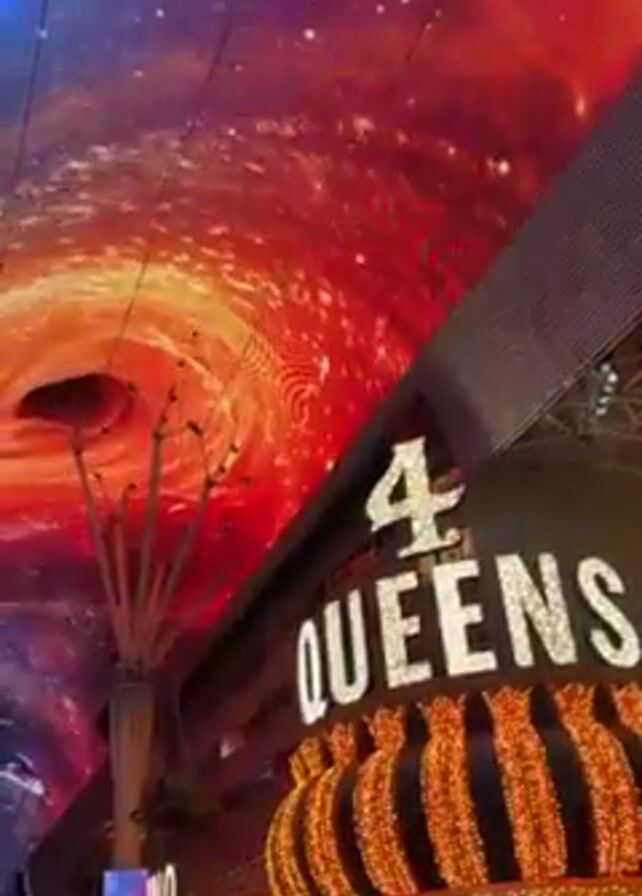 "4 Queens" casino in Las Vegas, Nevada, from a low angle. The casino sign is prominently displayed, illuminated with bright white lights. Above, a large LED canopy displays a dynamic visual of a black hole with swirling orange and red colors. There are speakers, and a few light fixtures visible on the sides of the canopy. The video captures the vibrant and immersive atmosphere of the Fremont Street Experience.