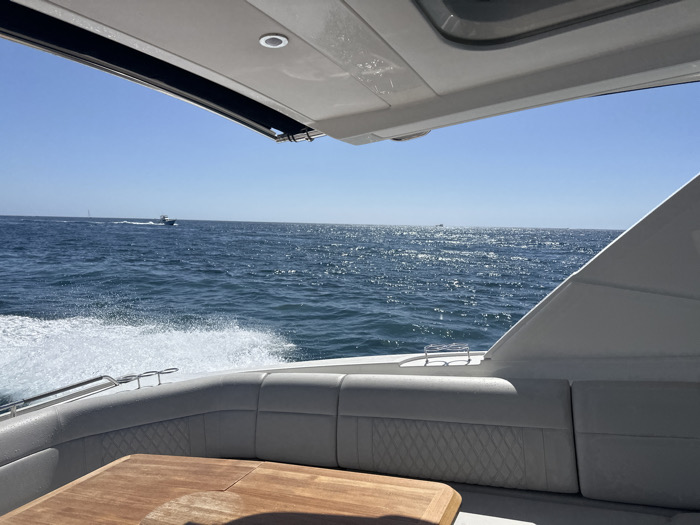 The image presents a detailed view from the interior of a moving motor yacht, looking out over the open ocean near Newport Beach, United States