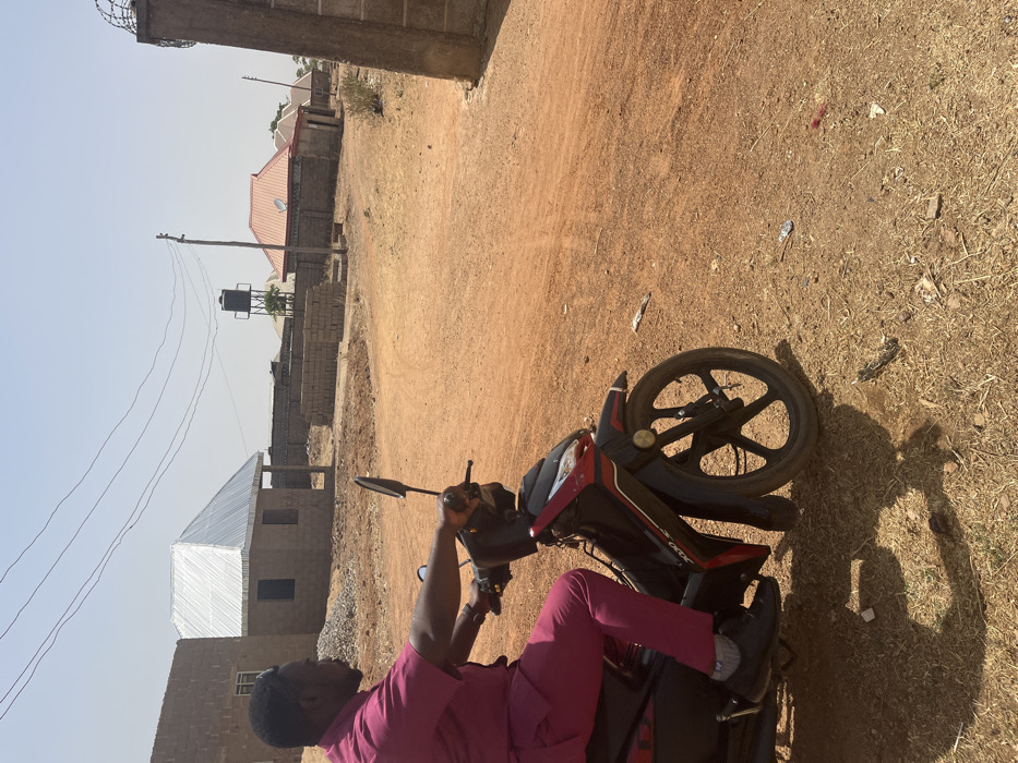 An outdoor scene in Kakau, Nigeria, is depicted under a clear sky with strong, direct sunlight casting prominent shadows. A male individual, dark-skinned with short dark hair and a beard, is seated on a red and black motorcycle, oriented rightward in the frame. He wears a magenta-colored short-sleeved shirt and matching trousers, dark shoes, and light-colored socks. His hands grip the handlebars of the motorcycle, which displays "300 S" on its side and has a five-spoke front wheel. The ground is an unpaved, reddish-brown dirt surface with sparse, dry grass and scattered refuse. The background features multiple structures: On the far left, a multi-story concrete block building with a single visible window. Adjacent to it, a single-story concrete block structure with a new silver corrugated metal roof, lacking windows or doors, is under construction. Piles of gray aggregate and concrete blocks are nearby. Further back, a low concrete block wall extends horizontally, behind which are several finished residential buildings with reddish-orange tiled roofs; one features a white satellite dish. A tall utility pole supporting multiple overhead lines stands near an elevated dark water tank. On the far right, a concrete pillar topped with barbed wire is partially visible.