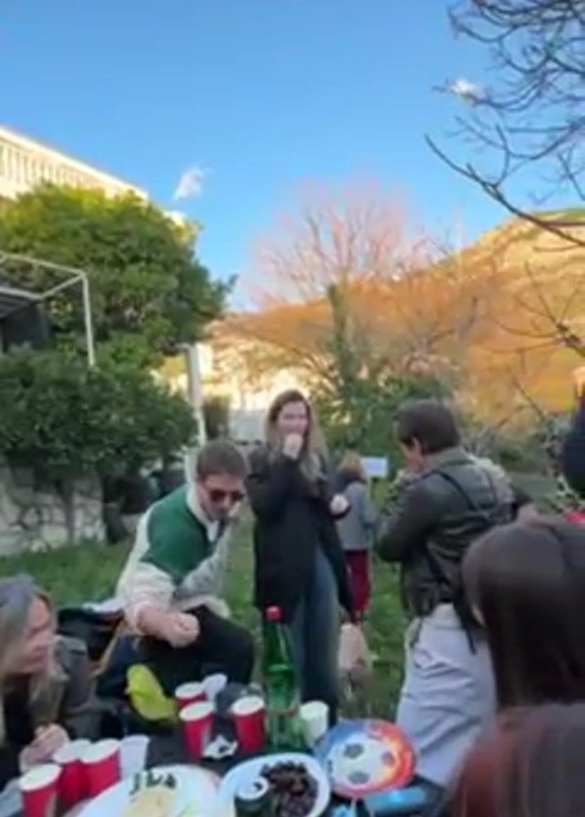 group of people gathered outdoors on a sunny day. They appear to be at a social gathering, possibly a picnic or party, with a table laden with food and drinks, including red plastic cups, plates of snacks like French fries, olives, and fruit. Several people are standing around the table, chatting and laughing. A dog is visible in the background. A barbeque setup is visible further back, behind the crowd, with smoke rising from it. The setting seems to be a backyard or garden with a house and some trees and vegetation in the background. Hills are visible in the distance. The camera moves around the scene, capturing different aspects of the gathering.