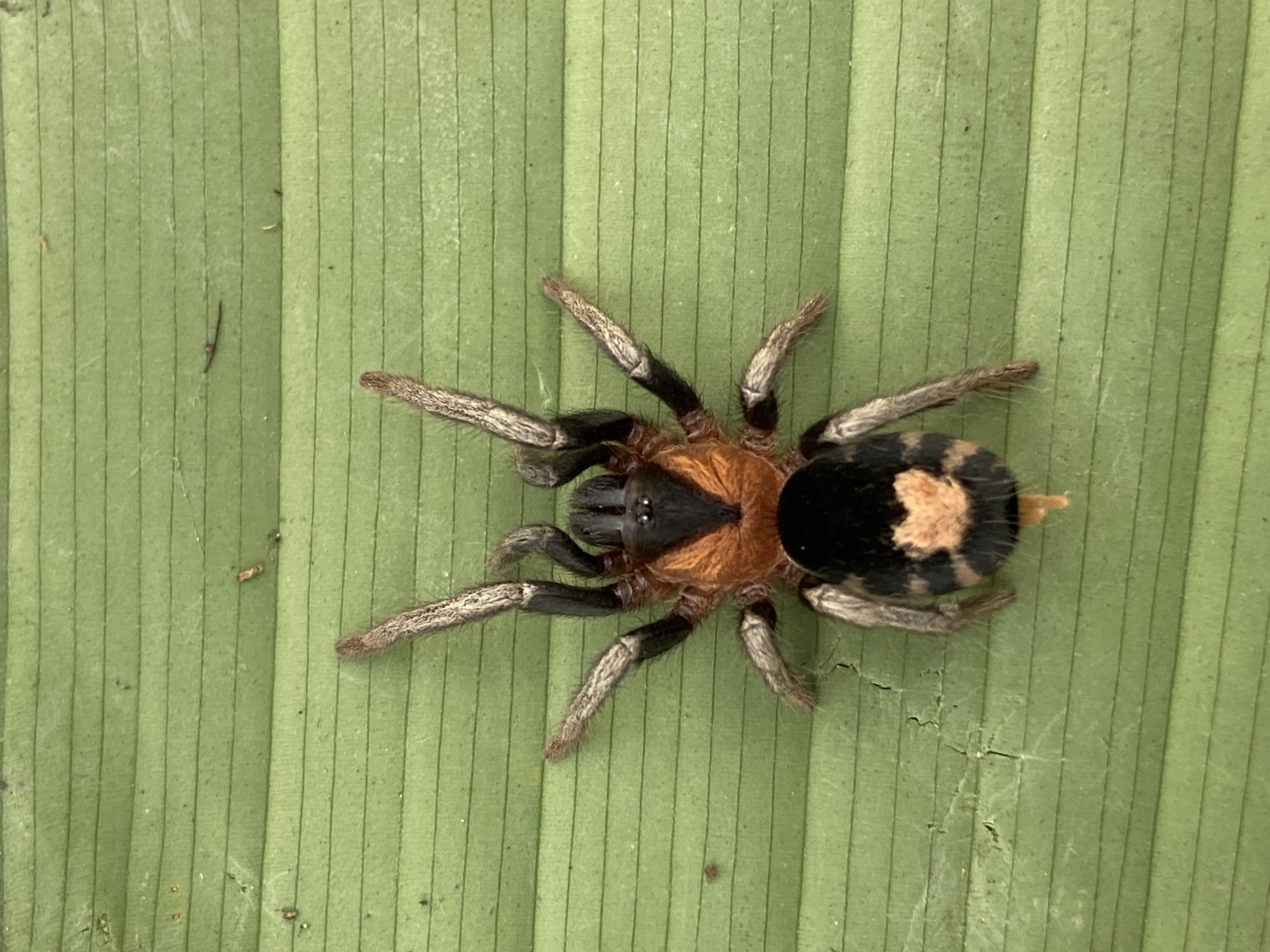 A high-angle, close-up photograph shows a tarantula-like spider resting on a green, ridged surface