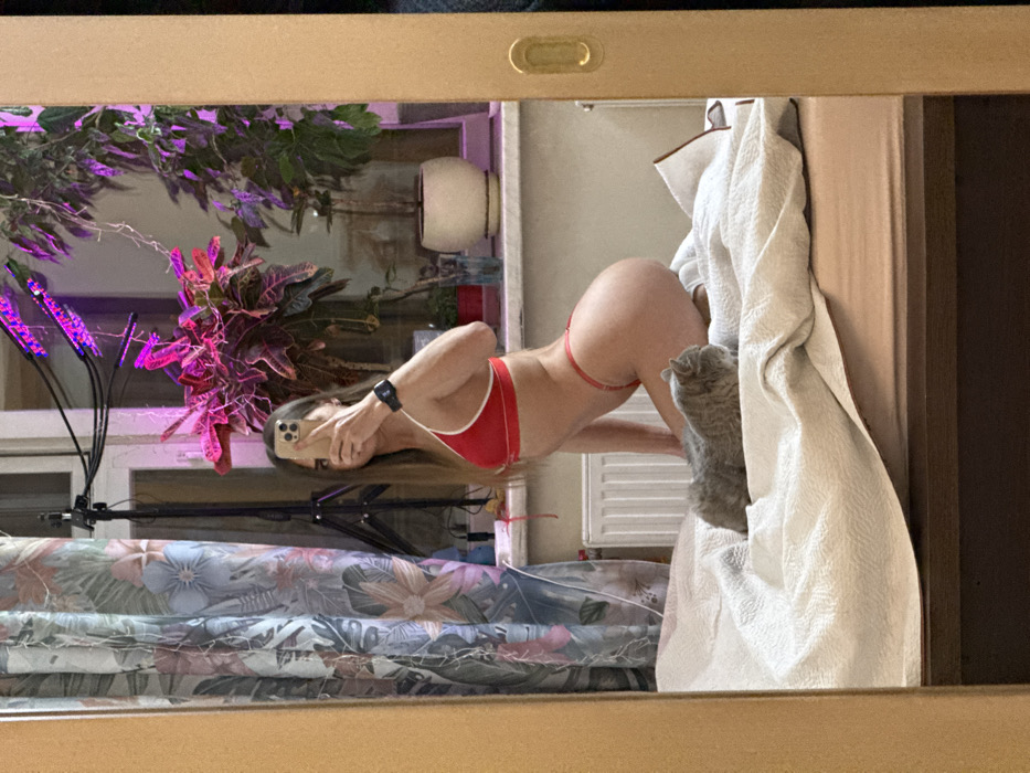 A woman in a red bikini takes a mirror selfie. She holds her phone with her left hand, obscuring her face. Behind her, there are plants and a window with grow lights. To her right, a light-colored towel hangs, with a grey cat standing on the towel. The mirror frame is visible, revealing a light brown color.