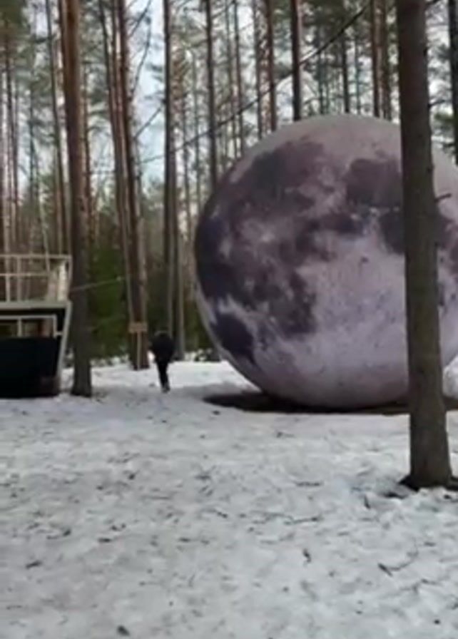 snowy forest scene. In the foreground, a large inflatable sphere with a realistic moon texture rests on the snow-covered ground. To the left, a person in dark clothing walks away from the sphere and towards a raised wooden structure resembling a ship's deck. The structure is painted black with white railings, and a wooden ramp leads up to it. Tall pine trees surround the area, creating a dense forest backdrop. The lighting suggests an overcast day. A rope connects the ship's deck to the surrounding trees.