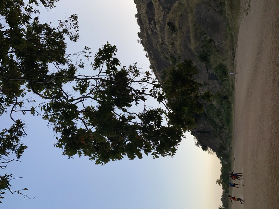 The image depicts an outdoor scene in the city of Gwong, Nigeria, during late afternoon or dusk. In the upper foreground, a large tree branch adorned with green leaves extends downwards and across the frame, partially silhouetted against a pale blue sky. The midground features an expansive, reddish-brown dirt field. On the left side of this field, four young males are actively engaged in playing soccer; one wears an orange shirt, another a blue shirt, and two others dark or red shirts, with one soccer ball visible among them. Further to the right on the field, a fifth young male, dressed in a light-colored shirt, stands alone and observes the activity, with a second soccer ball positioned near him. The background is dominated by a rugged, rocky hill or small mountain, characterized by exposed grey rock faces and interspersed patches of dry, sparse vegetation. The sky above the hill is clear, a gradient of light blue.