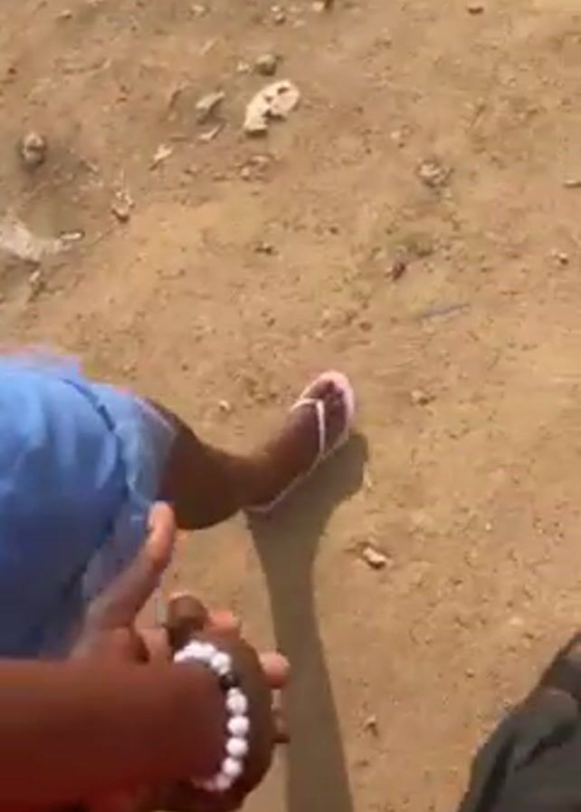 two people walking hand-in-hand on a sandy or dirt-covered ground. The camera is positioned as if attached to one of the individuals, showing their perspective. The person in the foreground is wearing an orange shirt and black pants with black sandals on their feet. A small child is holding their hand, wearing a light blue outfit and white flip-flops. The child also has a white beaded bracelet. The ground they are walking on appears uneven with scattered debris, including plastic bags, small rocks, and dry leaves. The overall lighting suggests it is daytime.