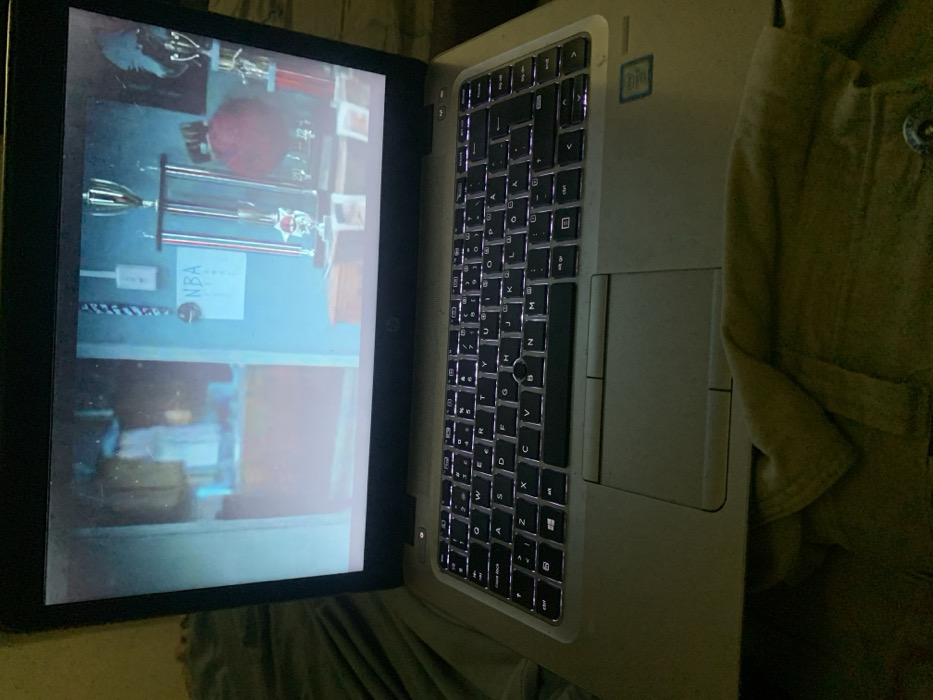 silver laptop with a black keyboard and a black touchpad. The laptop is open and displaying a video on the screen. The video appears to be of a room with a blue wall and a large trophy, a basketball, and other objects. The laptop is resting on a beige fabric surface. The location is Umuola, Nigeria, based on the coordinates provided.