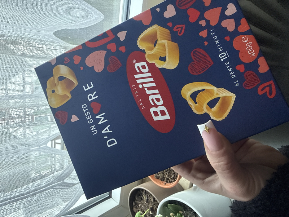 - "A box of Barilla D'Amare pasta is presented, featuring heart-shaped pasta images and decorative hearts on a blue background" by FM-k63fK2, licensed under CC BY 4.0