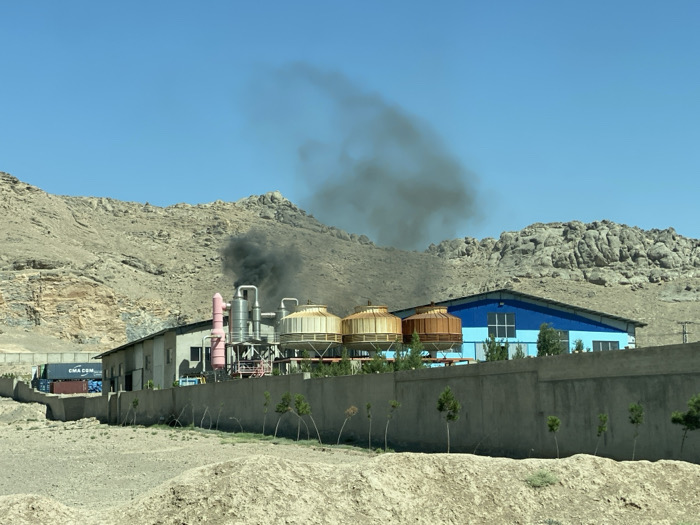 A low angle shot of a factory complex showing the buildings, equipment, and smoke plume. There are industrial buildings on the left and right side of the image, with a cluster of equipment and processing structures in the center. Dark smoke billows upward, partially obscuring the mountain range behind the factory. A low wall with saplings planted along it runs in front of the complex, with piles of dirt in the foreground. The sky is clear and blue.