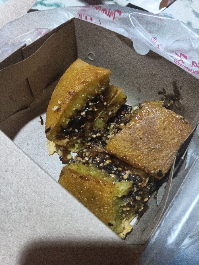 - "The image displays four irregularly cut slices of sweet folded pancake, identified as Martabak Manis, presented within an open, light-brown cardboard take-out box" by FM-4Sqr83, licensed under CC BY 4.0