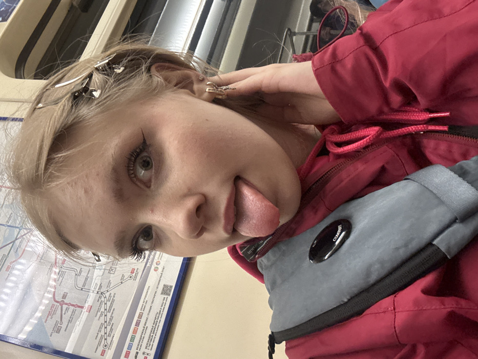 The image captures a close-up of a young female inside a Saint Petersburg Metro train car. The subject, with blonde hair, fair skin, and dark eyeliner, looks directly at the camera with wide eyes and her tongue extended. Multiple silver-toned hair clips are visible on the right side of her head. Her left hand is raised to her left ear, displaying several small earrings, including hoops and studs. She wears a red hooded jacket with matching red drawstrings. Over her right shoulder, a grey sling bag is visible, featuring a black oval emblem with "COMPANY" written in white. The background clearly shows the interior of a metro train, including a Saint Petersburg Metro map affixed to the wall, displaying lines and station names in Cyrillic, such as "ЖЕЛЕЗНОДОРОЖНАЯ". A horizontal metal grab bar is also discernible in the upper right.