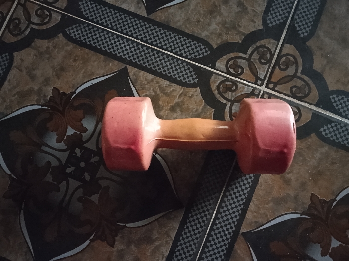 - "A single dumbbell is positioned horizontally on a patterned tiled floor within an interior space in the city of Unknown, Unknown" by FM-vsWPn2, licensed under CC BY 4.0