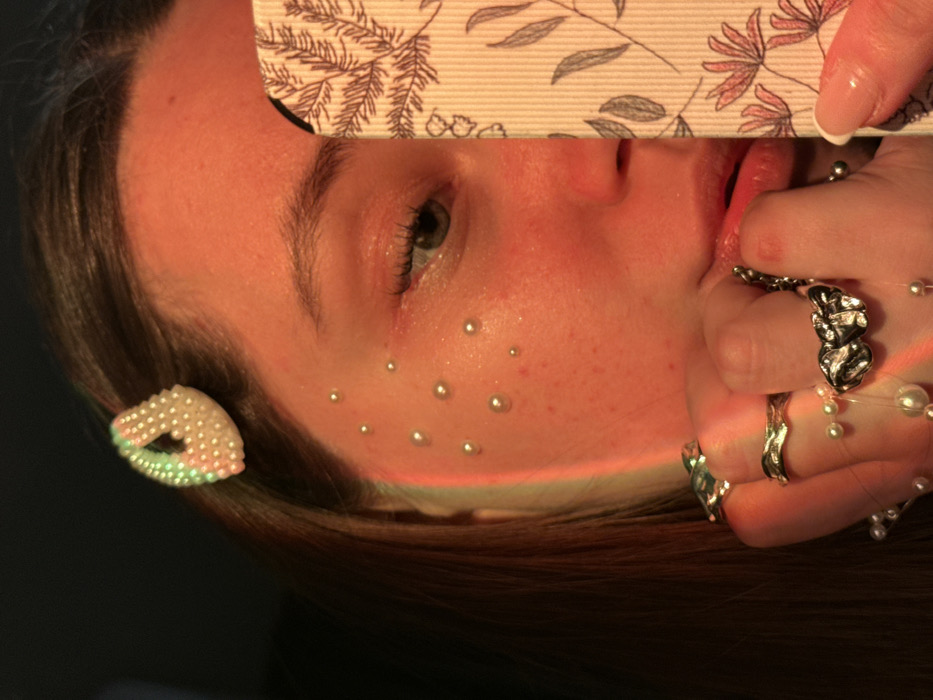 A female individual's partially obscured face is depicted in a close-up, illuminated by prominent red and green artificial lighting from the left. Her right eye, with a blue iris, is visible, along with parts of her forehead, cheek, nose, and mouth. Small, spherical, pearl-like adornments are affixed to her right cheek and beneath her eye. Her long, dark brown hair frames the left side of her face, secured near the temple by a light-colored, iridescent, pearl-beaded hair clip. Her right hand, adorned with multiple rings of various designs, holds a smartphone vertically, partially covering the left side of her face. The phone case features a light-colored, ridged surface with a pattern of dark botanical illustrations, including leaves and stylized flowers. Strands of small white pearls are draped around her fingers. Her fingernail visible on the hand holding the phone has a white tip. The background is dark and indistinct, providing no specific environmental details. The location within the city of Krasnodar, Russia, cannot be determined from the visual evidence presented in the image.