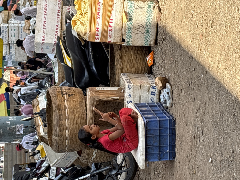 The image displays a bustling outdoor street scene, likely a market, within Ulhasnagar, India, under direct sunlight. In the foreground, a young barefoot girl, dressed in a red t-shirt and red pants, sits cross-legged on a white platform supported by an inverted blue plastic crate. She holds a light-colored rectangular electronic device, possibly a mobile phone, in both hands, actively viewing its screen. A light-colored bracelet adorns her right wrist. Adjacent to her on the dirt and gravel ground are a pair of light grey sandals and a half coconut shell. The mid-ground and background are densely cluttered with market goods and human activity. Multiple large, woven wicker baskets are stacked behind and around the girl. Numerous white cardboard or styrofoam boxes, some bearing labels such as "SFH SARA" and "DFS B.K.S.", are stacked on the right. Parts of two-wheeled vehicles, including a black scooter/moped and a motorcycle wheel, are discernible. An orange packet, appearing to be a snack wrapper, rests on the ground near the center-right. The background is populated by several adult individuals, mostly males, engaged in various activities typical of a market, such as standing, conversing, or managing goods. They are dressed in casual attire. A prominent grey pillar stands in the central background, partially obscured by a multi-colored market umbrella. A sharp diagonal shadow bisects the lower right quadrant of the foreground, indicating a high sun position.